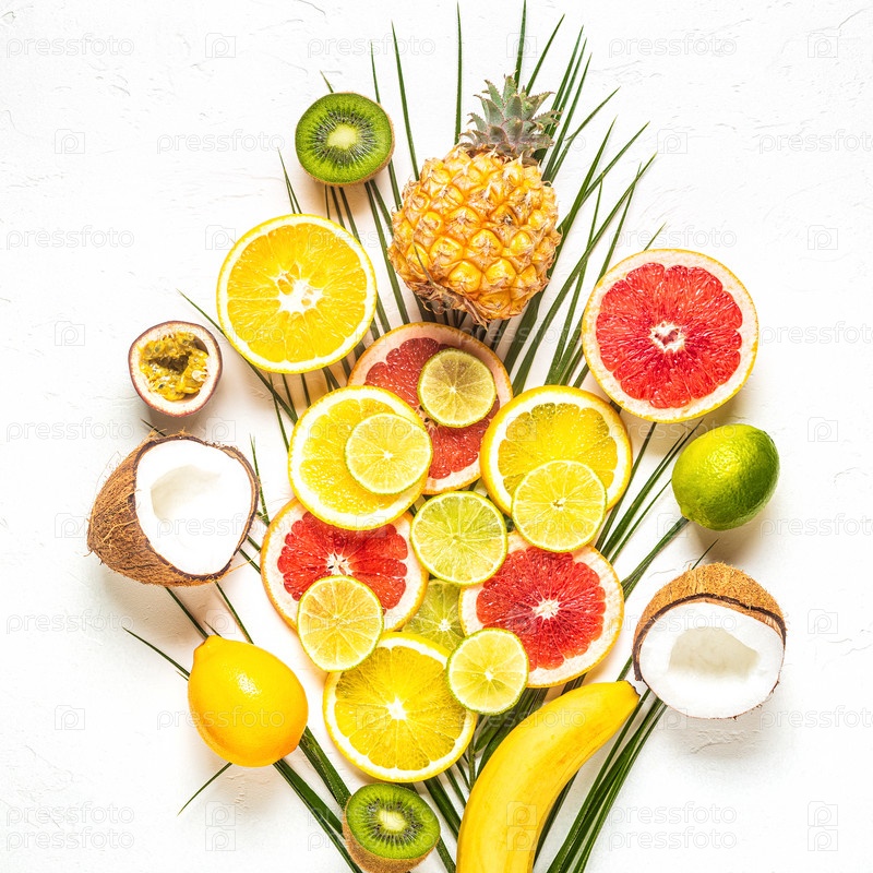 Тропические фрукты и пальмовые листья на белом фоне