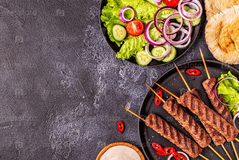 Традиционный ближневосточный, арабский или средиземноморский мясной шашлык с овощами и лавашом