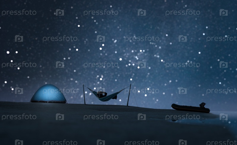 Панорама ночного лагеря: светящаяся палатка, человек в гамаке и лодка на берегу