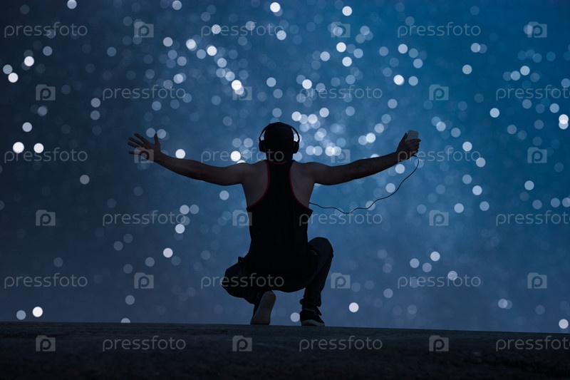 Мужчина в наушниках поднял руки вверх. Звездный фон боке