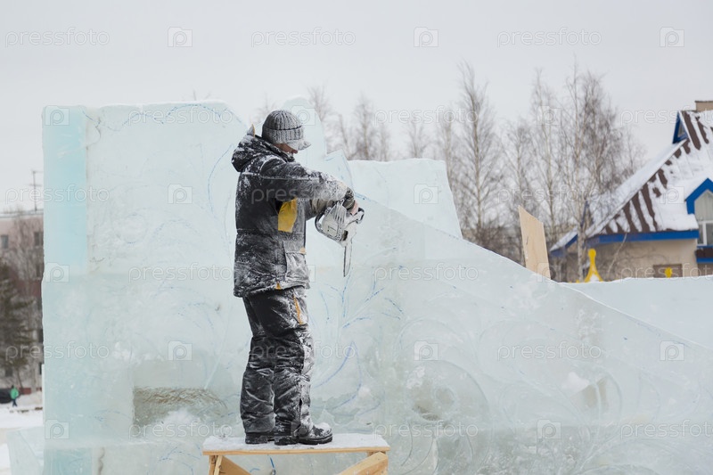 Рабочий режет лед бензиновой пилой