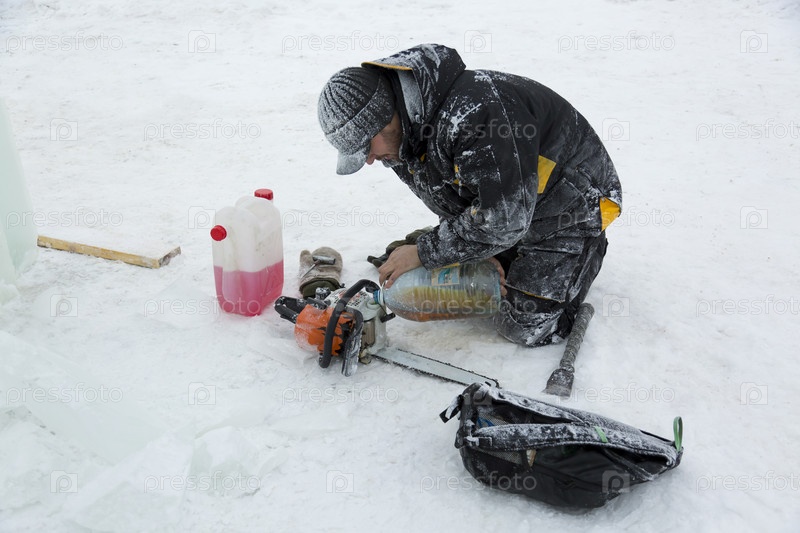 Рабочий заправляет бензопилу бензином из канистры