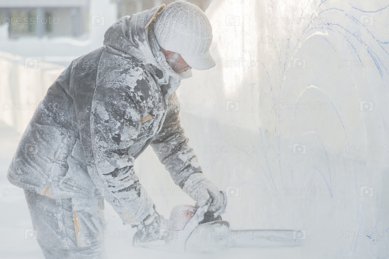 Мастер вырезает фигурки из ледяной бензопилы