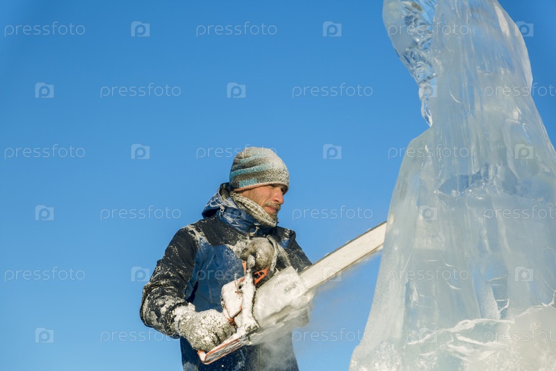 Скульптор вырезает бензиновую пилу Санты из ледяной глыбы
