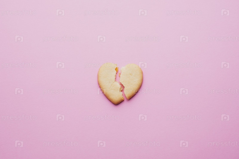 Печенье в форме сердца, разбитое сердце на розовом фоне, концепция разбитых отношений