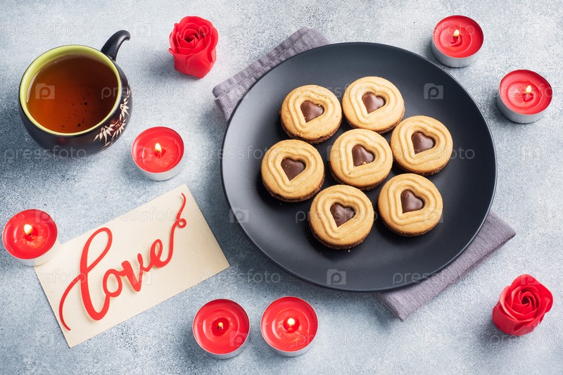 Домашнее печенье в форме сердец на тарелке, серый фон. Концепция День святого Валентина. копировать пространство