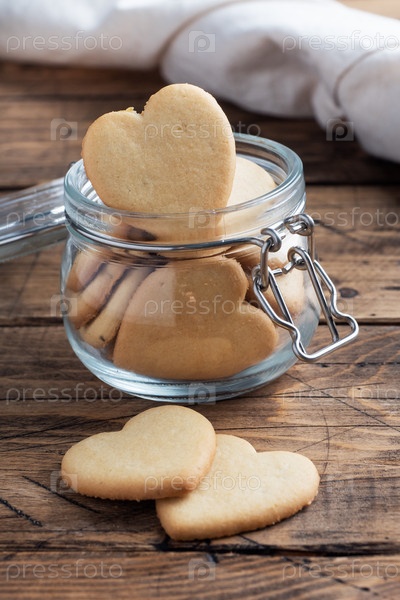 Домашнее печенье в форме сердец в стеклянной банке, деревянный фон. Концепция Дня святого Валентина