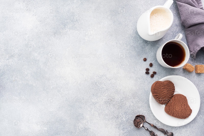 Шоколадное печенье в форме сердца и чашка черного кофе с молоком на столе, вид сверху. Скопируйте пространство