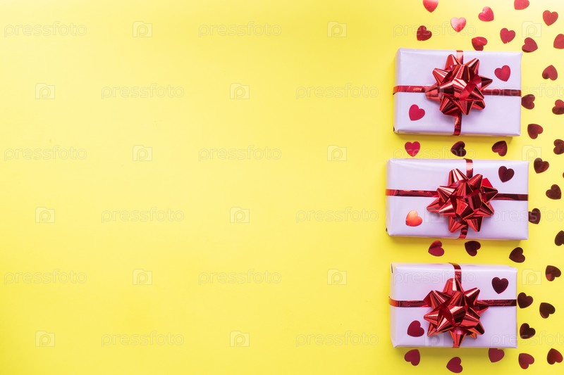 Композиция на день Святого Валентина, приветственная подарочная коробка с сердечками конфетти на желтом фоне. Плоская укладка