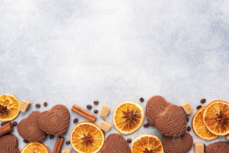 Печенье с шоколадным сердцем, апельсины, корица и острые специи на сером столе, вид сверху, пространство для копирования
