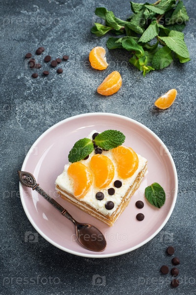 Бисквитные коржи с масляным кремом, украшенные кусочками мандаринового шоколада и мяты. Вкусный сладкий десерт к чаю