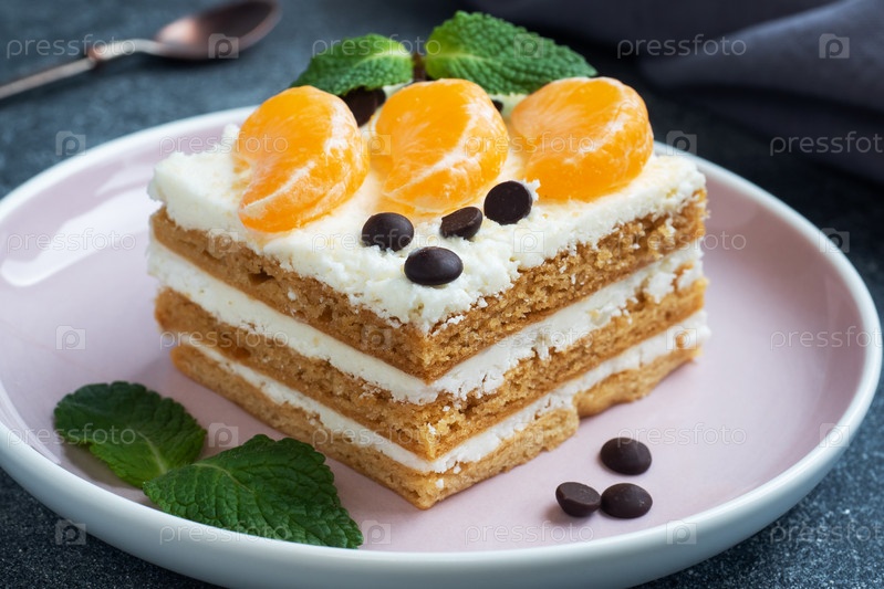 Бисквитные коржи с масляным кремом, украшенные кусочками мандаринового шоколада и мяты. Вкусный сладкий десерт к чаю