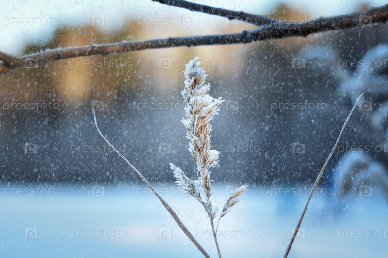 Заснеженная трава на закате зимой. Пасмурная погода на морозе