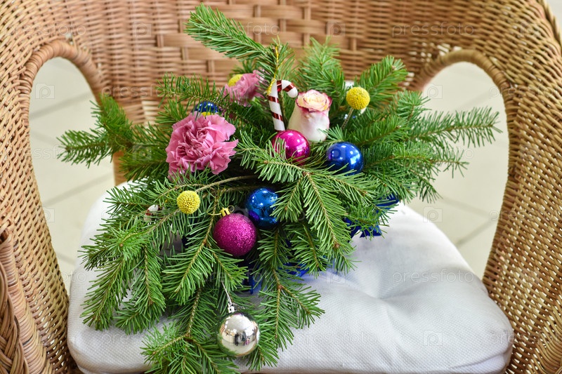 Букет елки с елочными украшениями и живыми гвоздиками и розами. На плетеном стуле