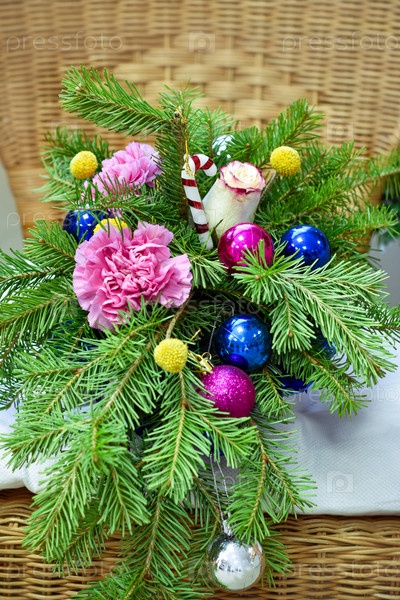Букет елки с елочными украшениями и прекрасными цветами. На плетеном стуле. Концепция подарка и праздника