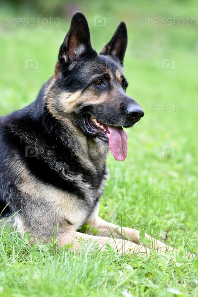 Восточно-европейская овчарка лежит на зеленой траве. Портрет восточноевропейской овчарки в профиль