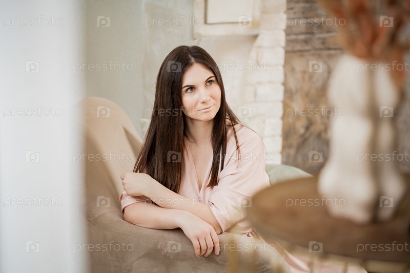 Портрет красивой женщины в халате, сидящей дома в уютном кресле