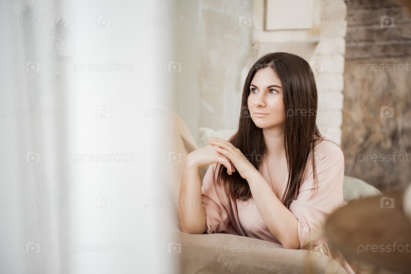 Портрет красивой женщины в халате, сидящей дома в уютном кресле
