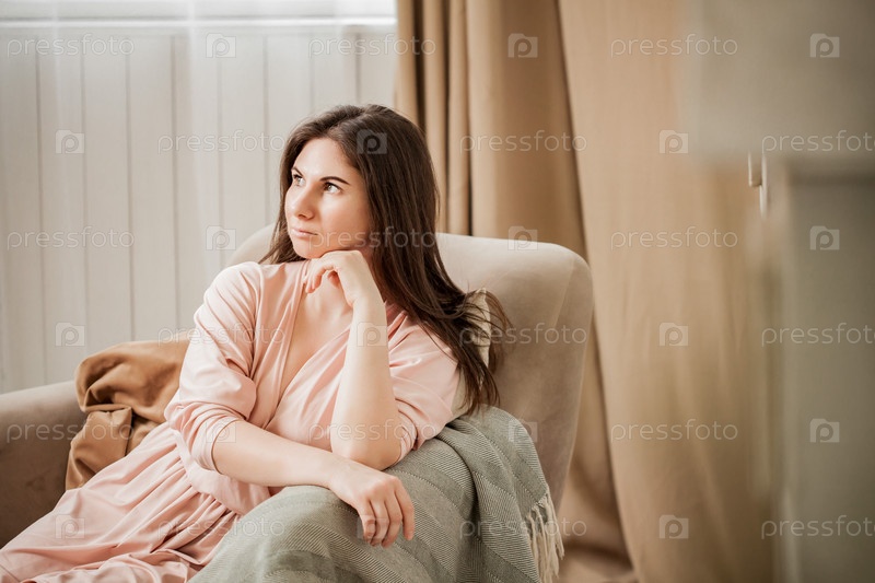 Портрет красивой женщины в халате, сидящей дома в уютном кресле