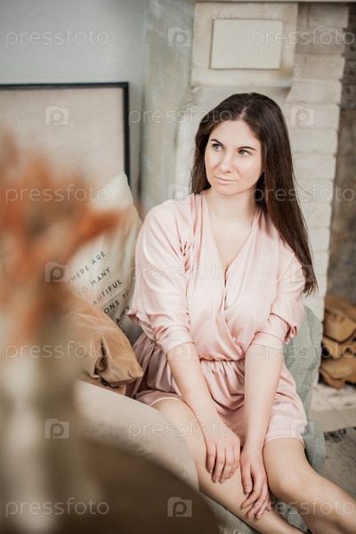Портрет красивой женщины в халате, сидящей дома в уютном кресле