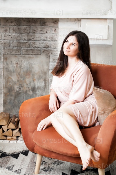 Портрет красивой женщины в халате, сидящей дома в уютном кресле