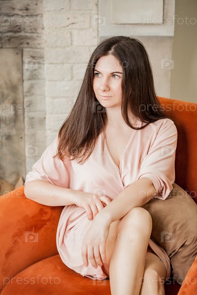 Портрет красивой женщины в халате, сидящей дома в уютном кресле