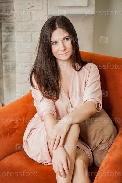 Портрет красивой женщины в халате, сидящей дома в уютном кресле