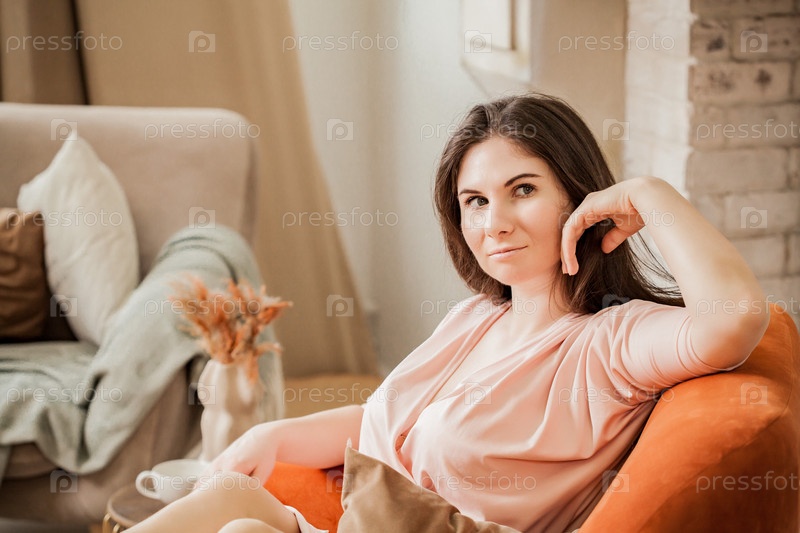 Портрет красивой женщины в халате, сидящей дома в уютном кресле