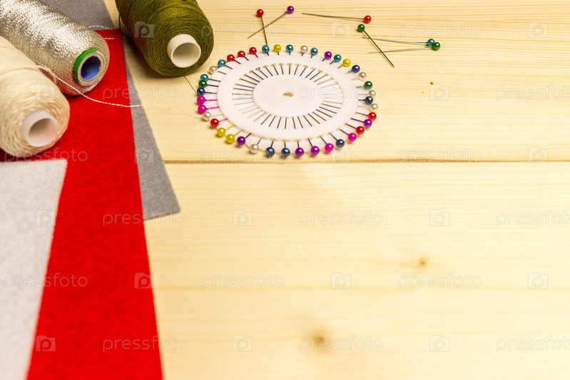 Рукоделие, ремесло, шитье и шитье - нитки, иглы и войлок на светлом деревянном столе