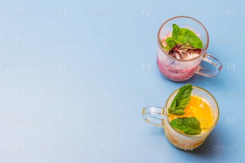 Праздничный коктейль из цитрусовых со льдом. Апельсины, лимоны, мята. Разноцветные трубочки для коктейлей, зонтики для коктейлей. Стеклянные чашки. Раковины. Синий фон