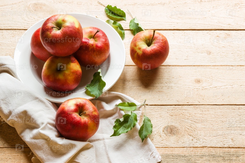 Спелые яблоки на белой тарелке на деревянном фоне. Яблоко уходит. Свободное место для текста. Малая глубина резкости