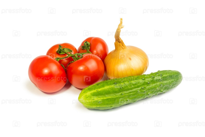 Огурец, красные спелые помидоры и золотая луковица на белом фоне. Он изолирован