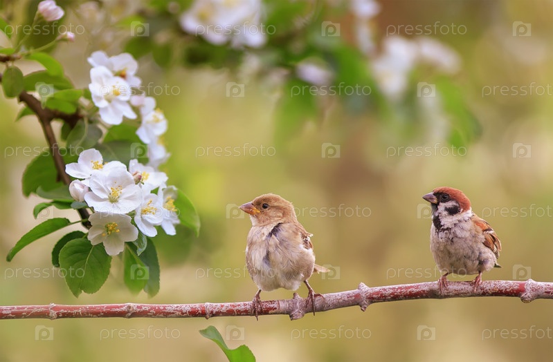 Птицы воробьи сидят весенним солнечным цветением на ветвях яблони с белыми цветами