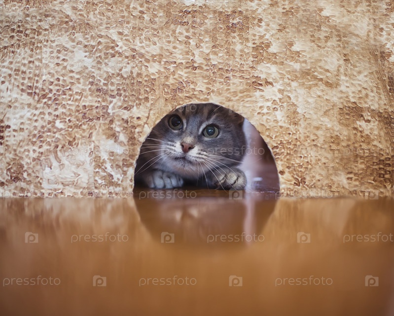Милый полосатый кот заглядывает в дырку в стене в поисках хорошей мышки