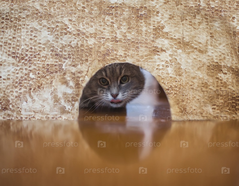 Милый полосатый кот заглядывает в дырку в стене в поисках хорошей мышки