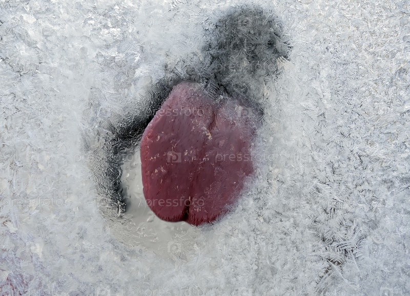 Зима портрет забавная собака лижет замерзшее стекло тающий иней