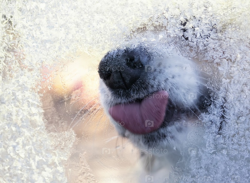 Портрет забавная собака лижет замерзшее стекло тает иней солнечным зимним утром