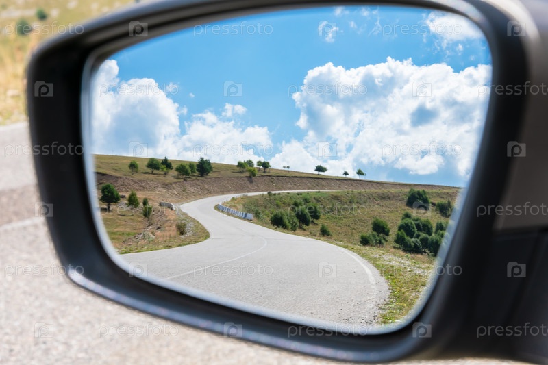 Извилистая дорога в зеркале заднего вида автомобиля