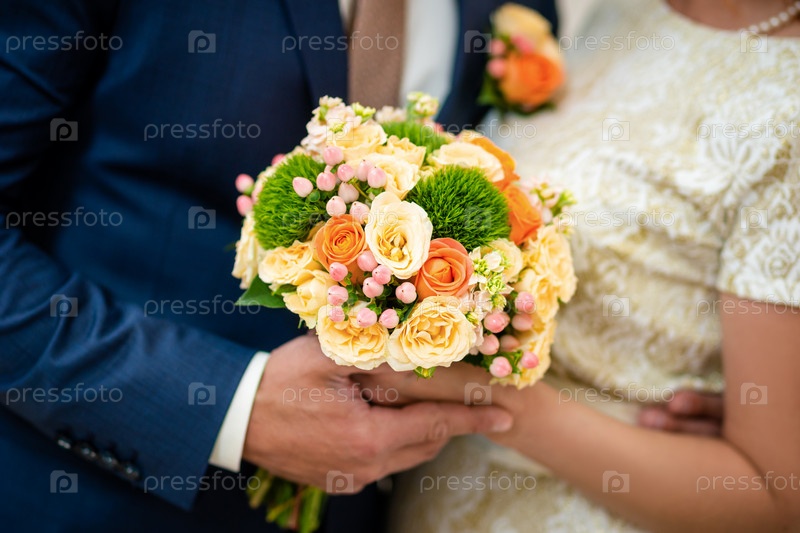 Букет цветов в руках молодоженов. Свадебные цветы