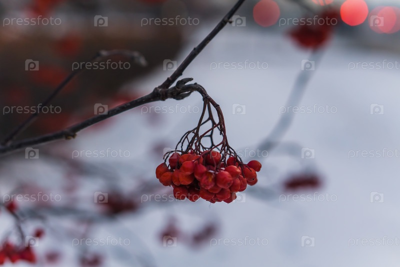 Ягоды рябины на ветке в морозный день