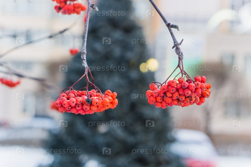 Ягоды рябины на ветке в морозный день