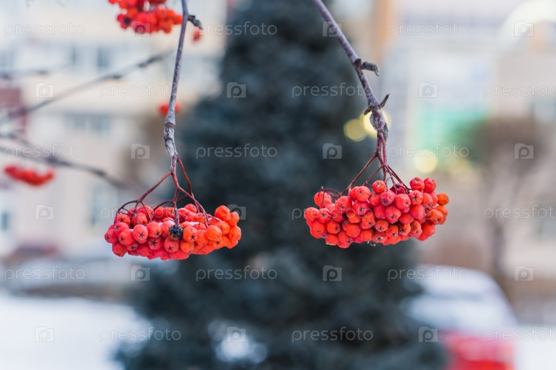 Ягоды рябины на ветке в морозный день