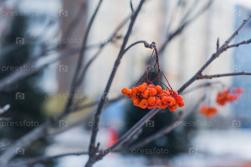 Ягоды рябины на ветке в морозный день