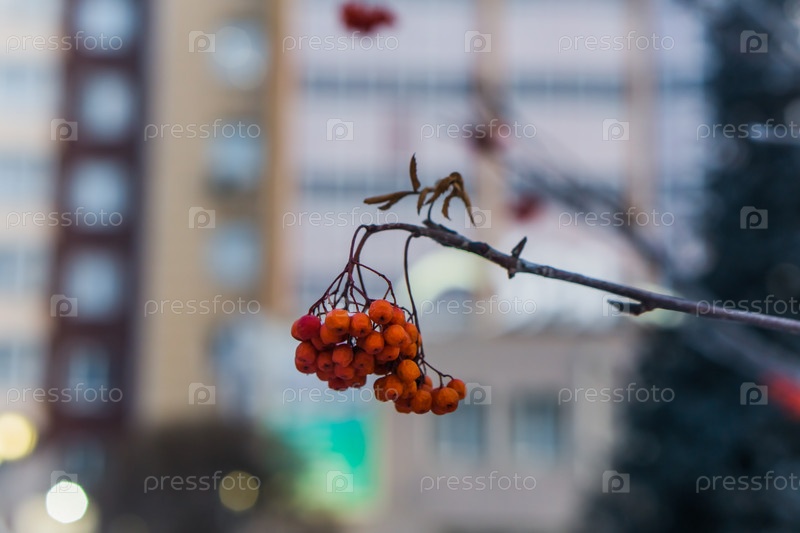 Ягоды рябины на ветке в морозный день