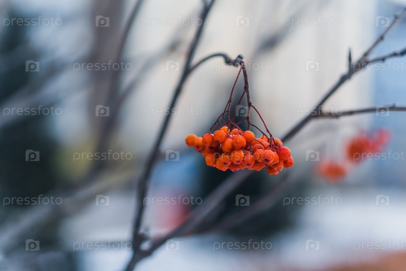 Ягоды рябины на ветке в морозный день