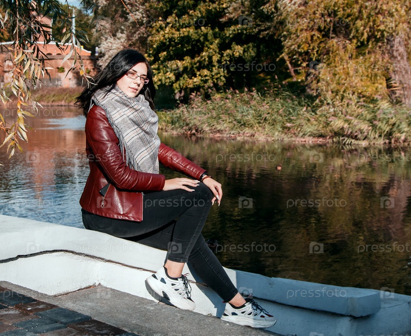 Молодая девушка в коричневой куртке и черных джинсах сидит на парапете возле пруда в городском парке в солнечный осенний день