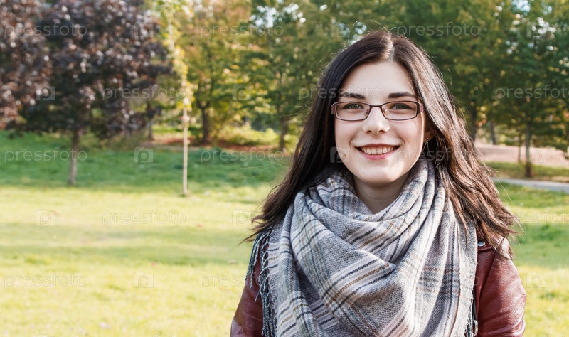 Портрет молодой красивой улыбающейся девушки в коричневой куртке в городском парке в солнечный осенний день