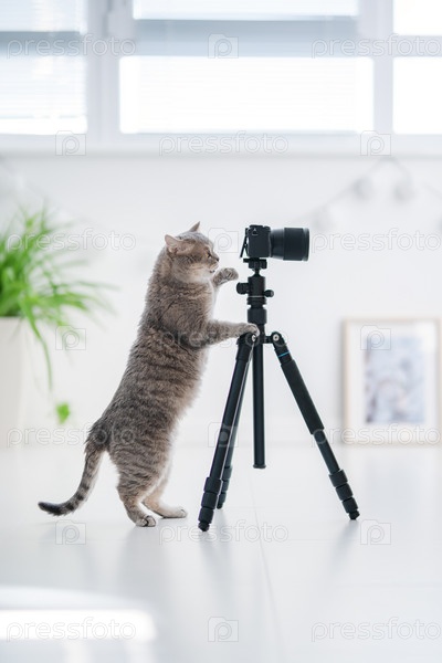 Кошачий фотограф. Шотландская прямоухая кошка с фотоаппаратом