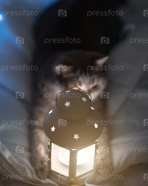 Шотландский кот с фонарем