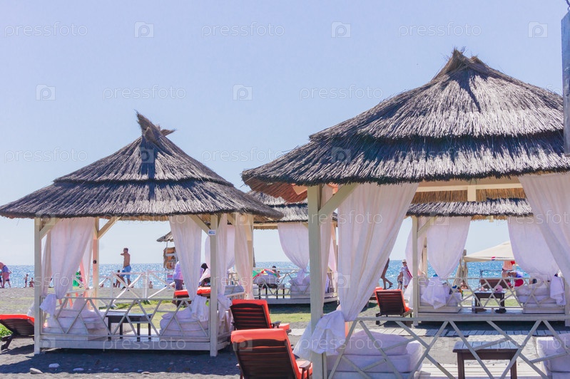 Сочи, Адлер, Россия - 07 сентября 2019 г. - Много бунгало на пляже. Концепция курорта для отдыха